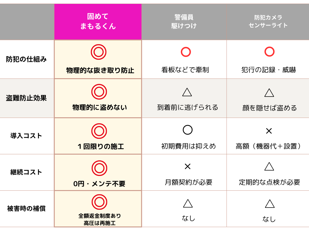 被害の深刻化を防ぐためにも、物理的な抜け・盗難防止策として「固めてまもるくん」の導入をご検討ください。