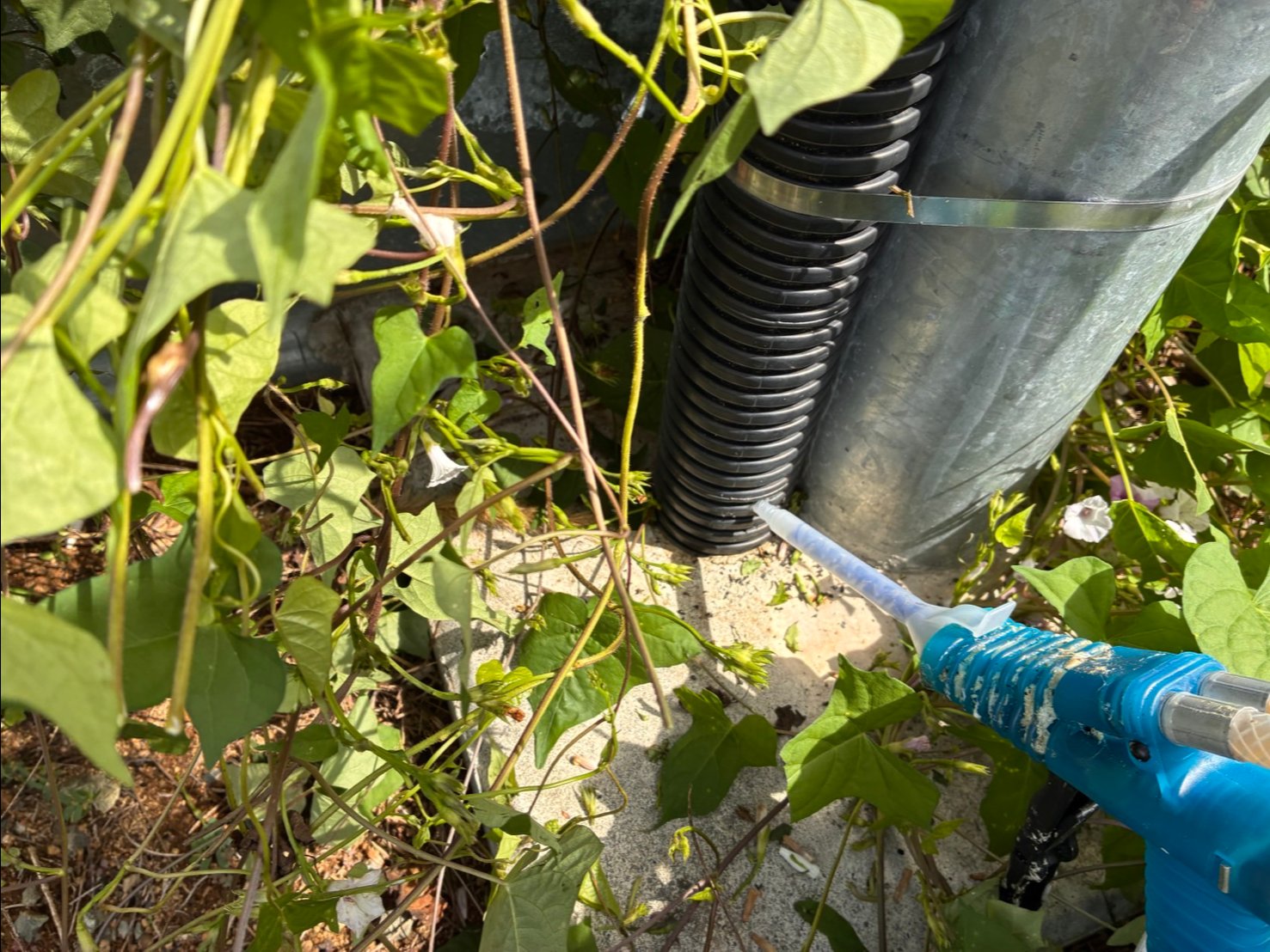 施工では、既存のカナフレキ(ケーブル管)を活かしながら専用溶剤を注入。