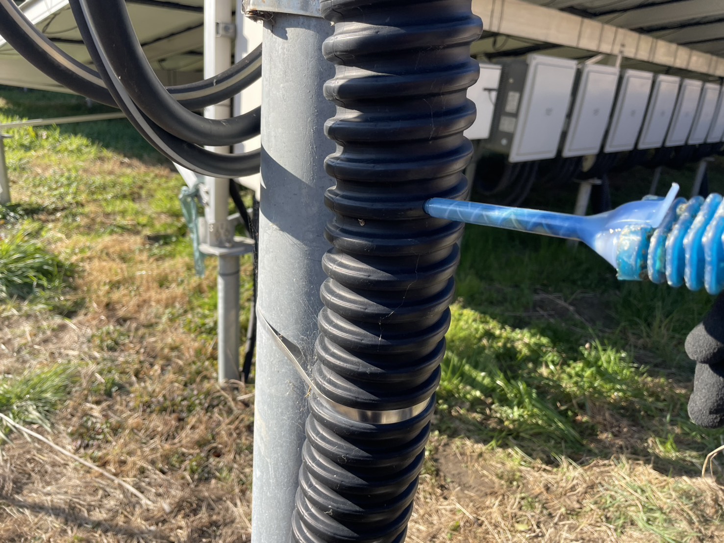 静岡県湖西市にて、低圧太陽光発電所のケーブル盗難対策として「固めてまもるくん」の施工を行いました。